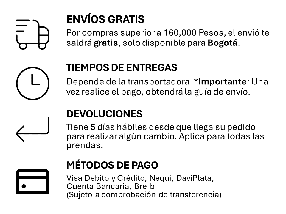 Devolución producto: tienes 5 días calendario desde que llegan tus prendas para realizar el proceso de cambio.